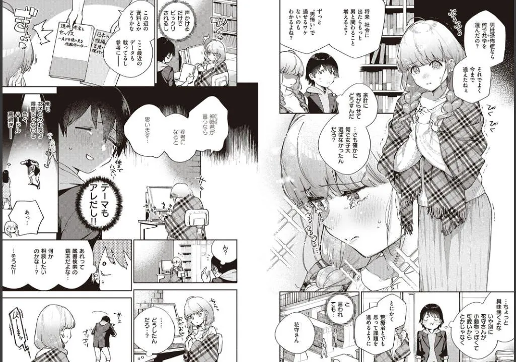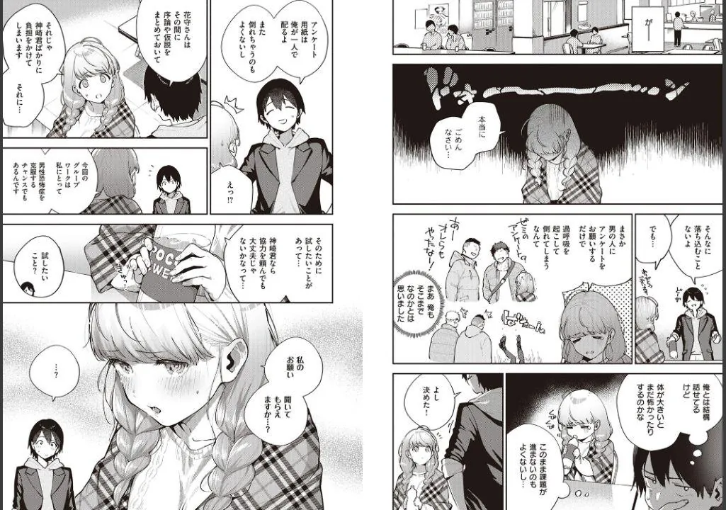 男性恐怖症の美少女・花守さんと取り組むことになったグループワークのテーマは『若者のセックス離れ』。普通に男の子と話すだけでも苦労する彼女を助けたいとフォローに奔走する神崎君を、花守さんはホテルに誘って『神崎君に、私の初めての男の人になって欲しいんです』と伝える。初めて怖くないと思えた男の人に、震えながらも勇気を出して告白する花守さん。けれどそんな一生懸命な想いとは裏腹に花守さんの裸はあまりにもエッチすぎて…。