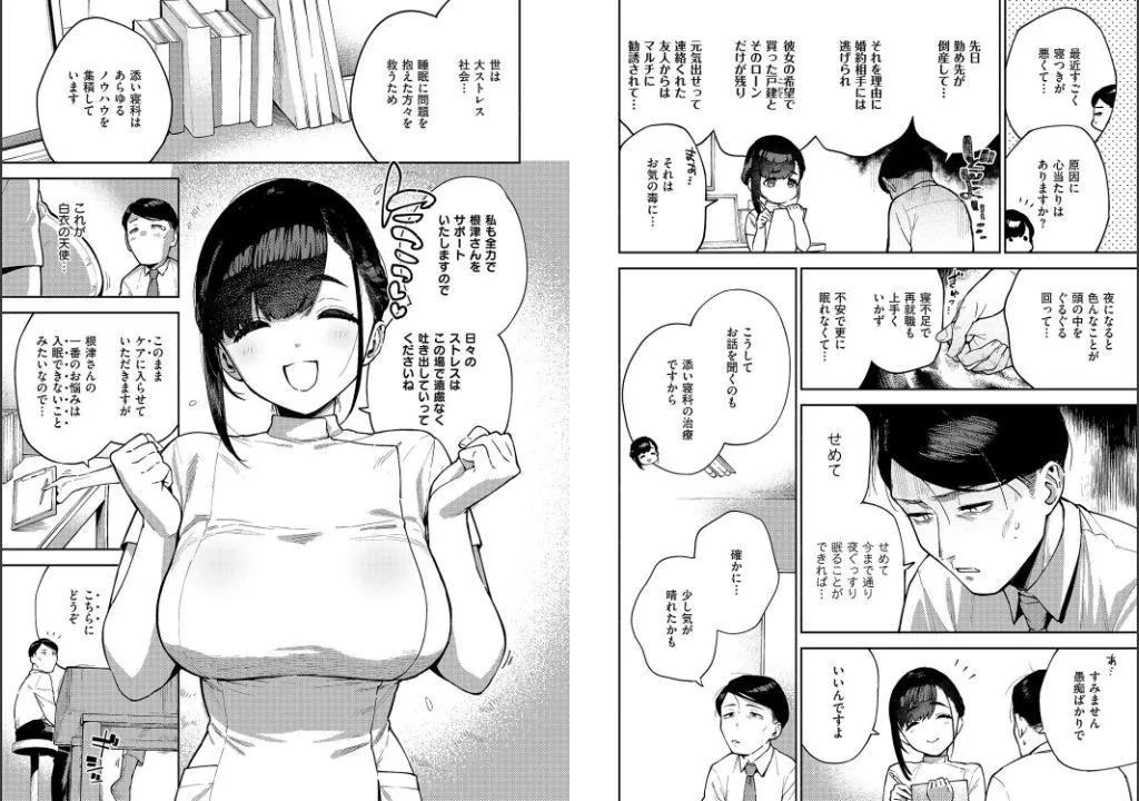 不幸が重なりストレスで夜も眠れなくなった俺は、訪れた添い寝クリニックで美乳の看護師・見野さんとの出会いを果たす。