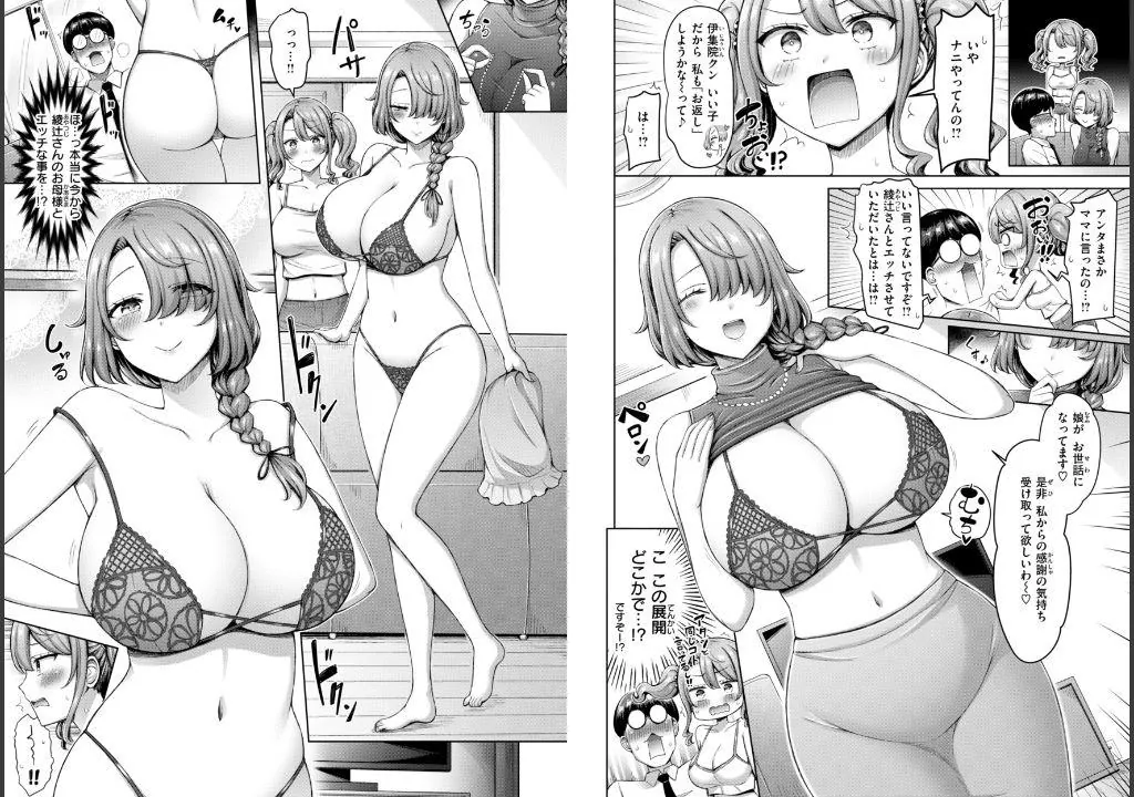 お礼がしたいと家に招かれ、綾辻さんとエッチしたとうっかり口を滑らせてしまうと、自分からも感謝の気持ちを受け取ってほしいと母・千穂(ちほ)に下着姿で迫られて……!?