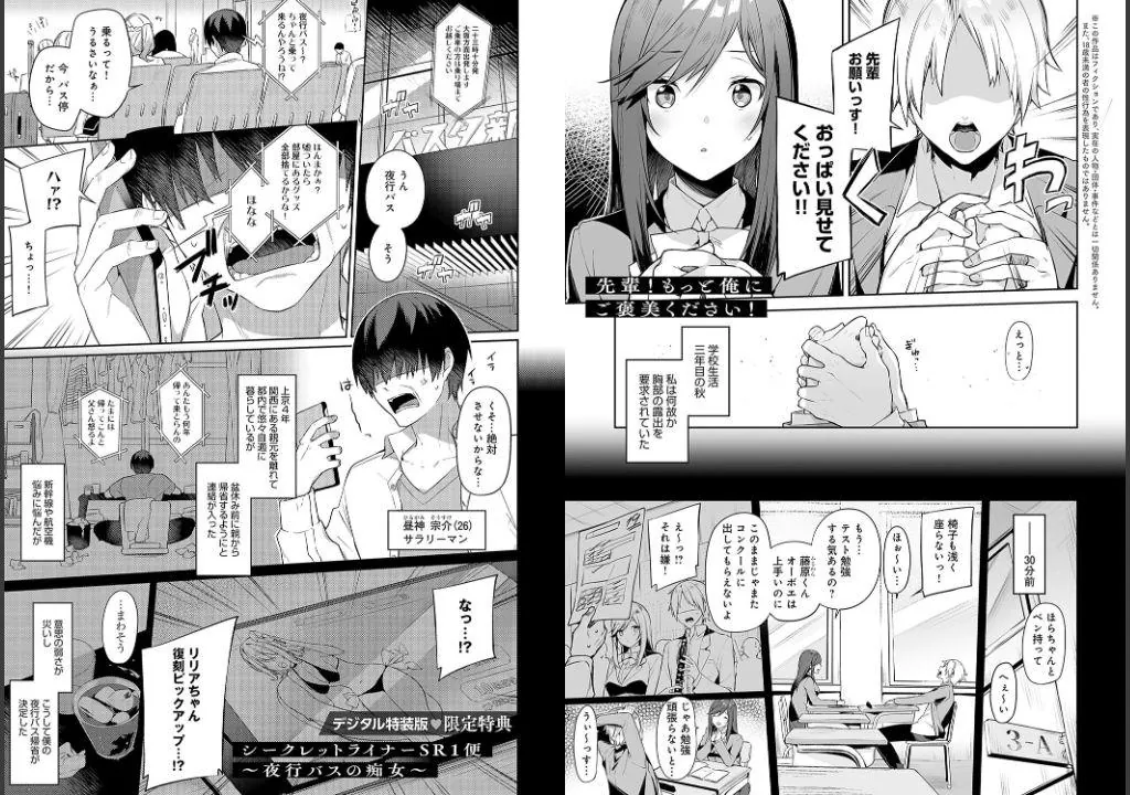さらに、デジタル特装版には、夜行バスでドスケベな女の子に襲われちゃう同人作品2作品を大ボリューム合計64P追加収録♪