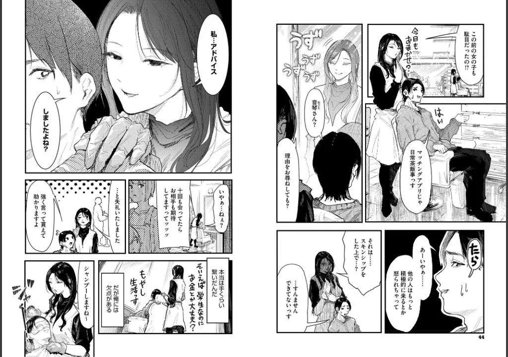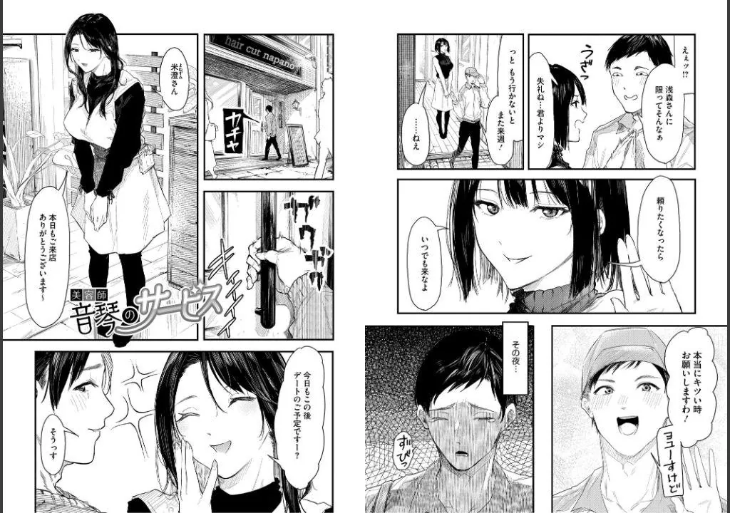 恋愛に不器用な潔癖症の主人公が担当美容師と距離を縮める「美容師音琴のサービス」など、