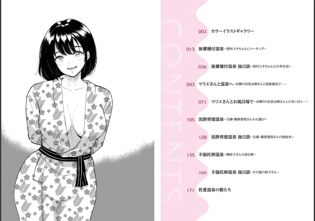 大人気作家≪ビフィダス≫が紡ぐ背徳温泉エロスが1冊のコミックスに!! 大学の後輩・隣の部屋のお姉さん・人妻ect…それぞれが抱えた事情が温泉旅館での情事へと発展し、快楽を求めていく――!!!