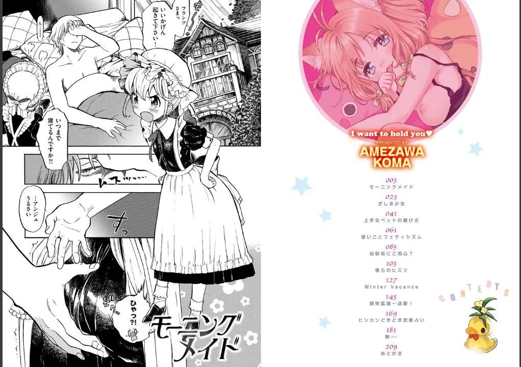 小刻みに震える裸身をギュッと抱き寄せる抱擁短編集です。ご主人様の起床を騎乗位でお手伝いする「モーニングメイド」をはじめ、セックスするたびに幸せでおナカを満たす「ざしき少女」やケモ耳ペットとのペッティングを描いた「上手なペットの躾け方」、さらには、おマセな妹とふたつの意味で通じ合う「繋」ほか、愛らしすぎる娘たちの性愛を純度100%でお届け。思春期の香りを胸いっぱいに吸い込める1冊です。