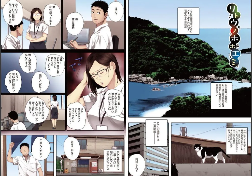 有給を取るように命じられた岡田は、これといってしたいこともなかったので小さな離島を訪れることにした。何もない漁村、でも宿屋のおかみさんは子連れの未亡人だけど美人だ。夜、目を覚ました岡田は、そのおかみさんが村の男たちとあけすけなSEXをしているのを目撃する(リトウノホホエミ)