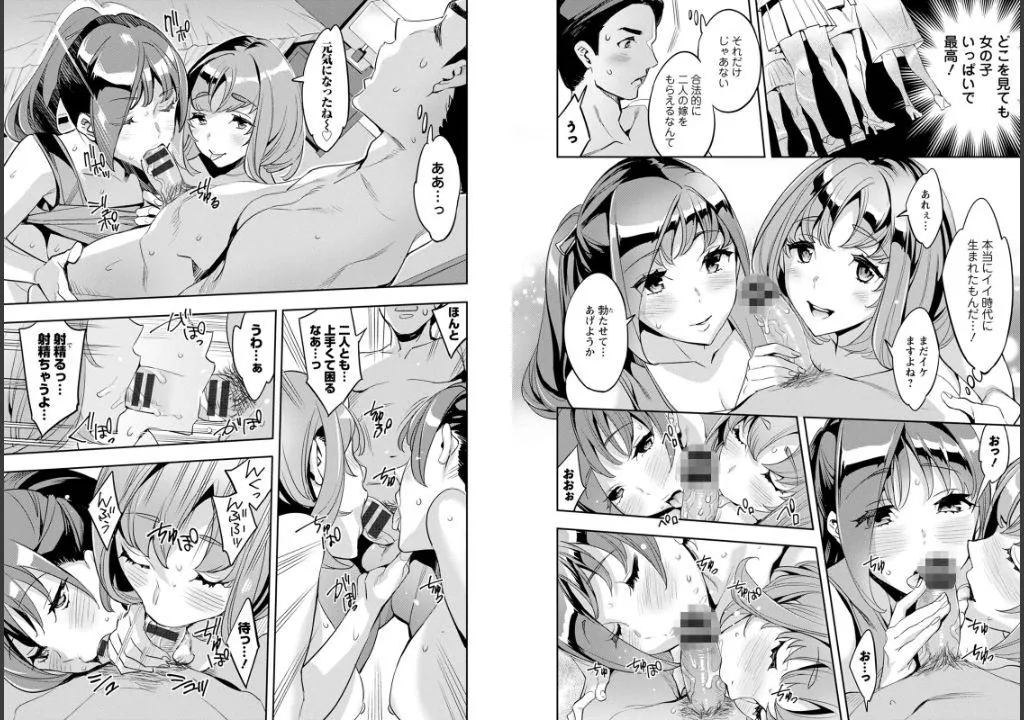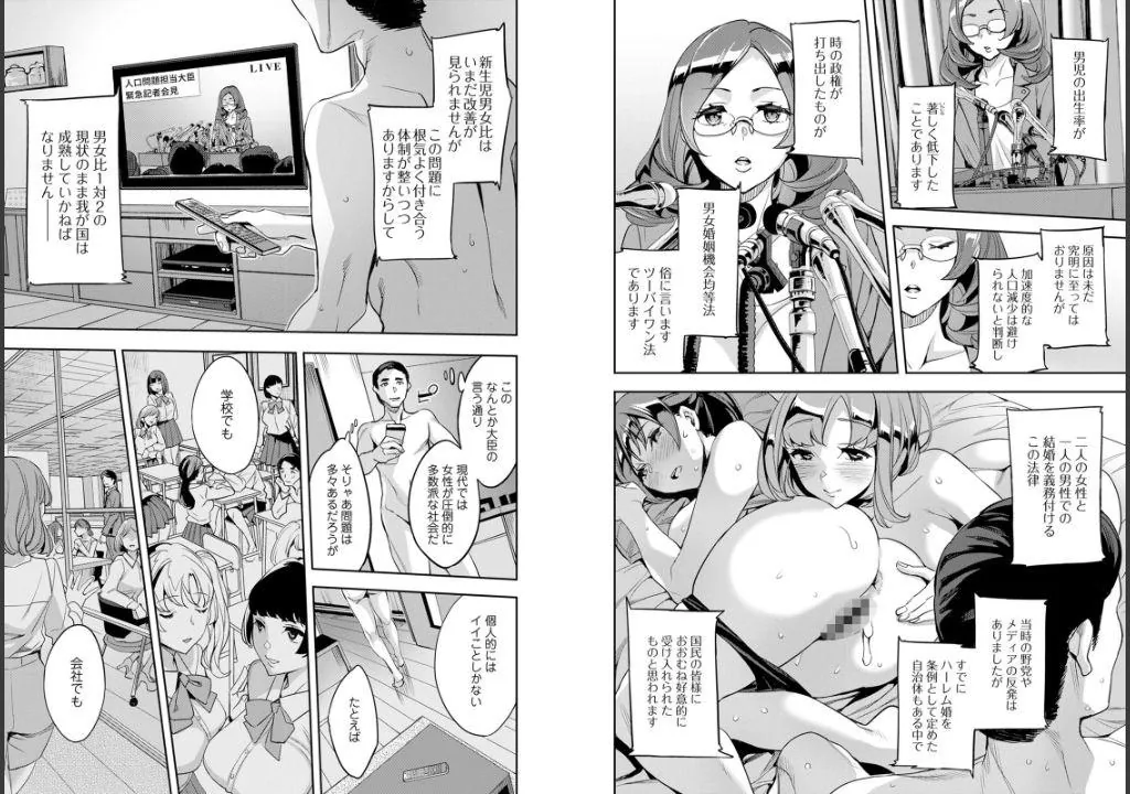 男児の出生率が著しく低下し高女性率社会となった世界では、男女間と同様に女性同士も愛し合う濃密SEX社会となっていた。女性で溢れる世の中で女2対男1の結婚が義務付けられ、全ての家庭がハーレム状態に!毎晩3Pで愛し合う色々な家庭の様々な情事を描く、エロエロ合法ハーレム物語!